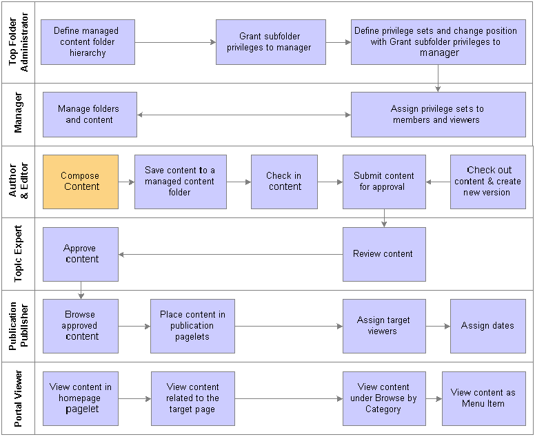 This flowchart illustrates the Content Management Managed Content process and the roles involved in each step: