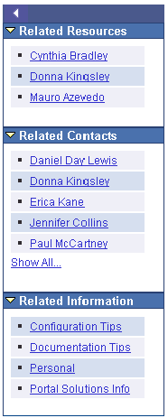 The Related Resources pagelet derives its resources from the Resource Finder feature. Resource Finder is a highly flexible repository that can receive data loads containing information about any entity, along with links that relate these entities to each other. These entities are typically things like customers, suppliers, employees, departments, locations, companies, and business units.