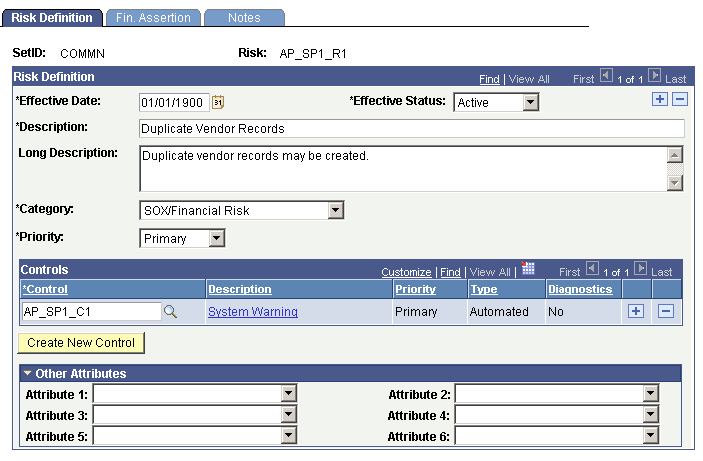The system includes several fields, which we refer to as “other attributes” fields, that are provided for storing additional attributes that are applicable to your implementation. No processing logic is associated with these fields; as delivered they are informational only. These fields appear within the Other Attributes group box on the definition pages for master and instance level processes, risks, controls, and test plan templates, as well as on the action plan and test plan pages. These fields can be configured as list boxes or free-form text, depending on the option you select on the Internal Controls Enforcer General Preferences page. Because these fields are keyed by setID, you can either have a common set of other attribute fields for your organization, or define them differently for each compliance project, depending on how you define your setIDs and record groups.