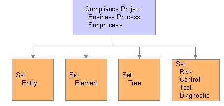 Data RelationshipsWhen you define a compliance project, you associate it with a default setID. This controls which sets of database records the compliance project uses. The following diagram shows the relationship between a compliance project's business processes and subprocesses and the sets of data that it can access when the system generates process instances.