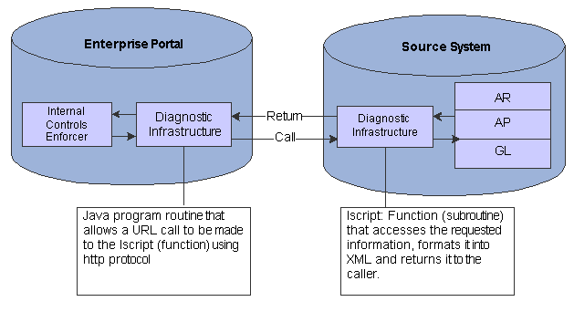 The delivered diagnostics require that single signon be enabled between the PeopleSoft Enterprise Portal database and the source PeopleSoft Enterprise database.