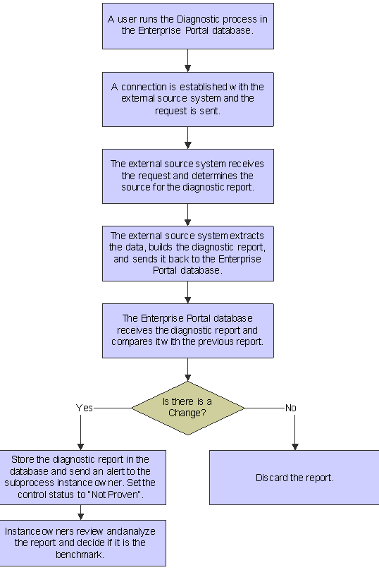 You run this process to generate diagnostic reports for a specified compliance project. You can run the process for all diagnostics or a specified list of diagnostics within a single compliance project, based on the parameters that you enter. For each diagnostic that is processed, the system passes the query or function to the external source system, retrieves the resulting data and compares it to the most recent diagnostic report, and if there are changes, stores the report records in PeopleSoft Internal Controls Enforcer.
