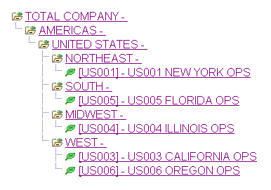 When you first access either tree viewer page, the tree is collapsed and the first row of the grid contains totals for the entire tree while subsequent rows contain subtotals for each top-level node, as shown in the following example.