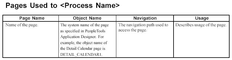 In the documentation, each page or panel in the application is included in an introductory table that contains pertinent information about the page. These process introduction tables appear under headings that follow the naming convention of "Pages Used to <Process Name>" where the process name reflects a business process that is meant to be accomplished by using the pages or panels in the table. Not all of the information is available for all pages or panels. This example shows a process introduction table with more information about the contents of each column:
