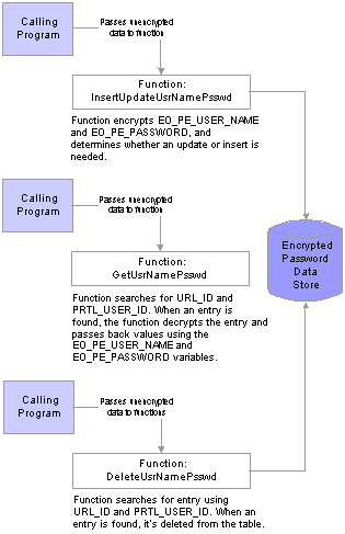 The following diagram illustrates a way in which the InsertUpdateUsrNamePsswd, GetUsrNamePsswd, and DeleteUsrNamePsswd common functions could be used.