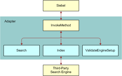 Siebel Search Administration Guide > Siebel Search Integration API Reference > Search Integration API OverviewSiebel Search can be integrated with a third-party search engine by implementing the Search integration API (application programming interface). Use the API method reference to build an adapter to integrate with a third-party search engine. All arguments passed between the Siebel application and the third-party adapter are in XML format. The communication format between the third-party adapter and search engine is not predetermined. When a third-party adapter has been implemented it must be enabled in Siebel Tools and in the Siebel Search Administration UI, see Integrating a Third-Party Search Adapter with a Siebel Application. A third-party implementation of the Search API will be comprised of the following elements outlined in Figure 2: