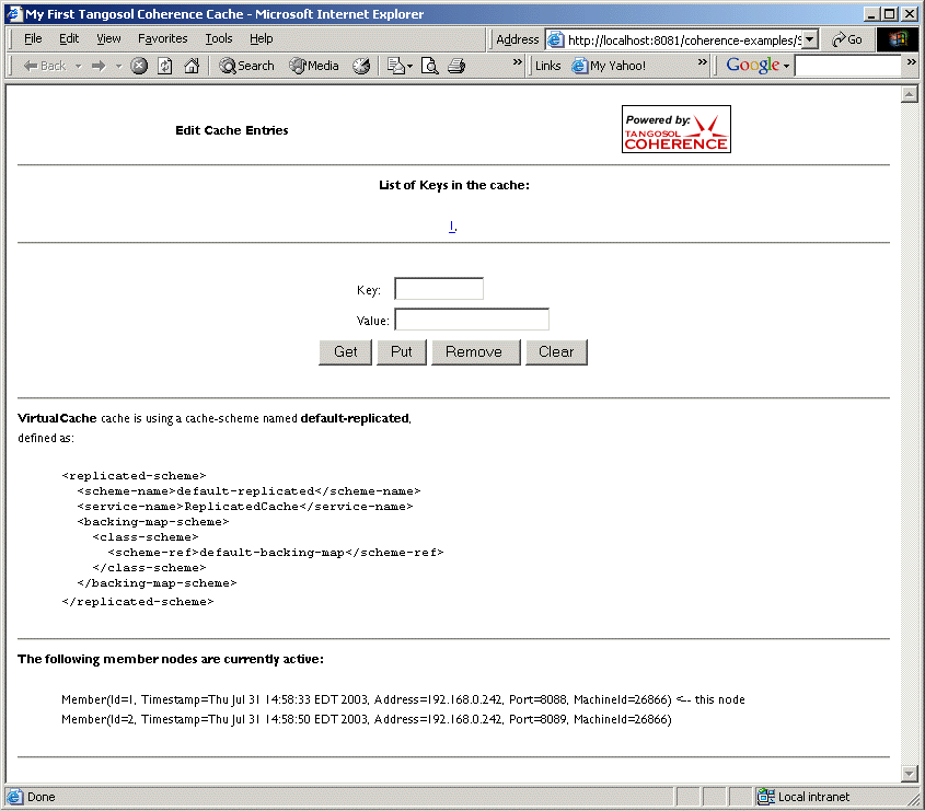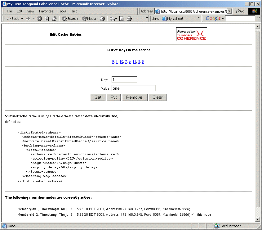 As with the command line application please try adding, updating and removing entries from multiple instances of the application server. Also please notice the information about the cache configuration and cluster membership at the bottom of the page. As cluster members are added and removed, this information will change.