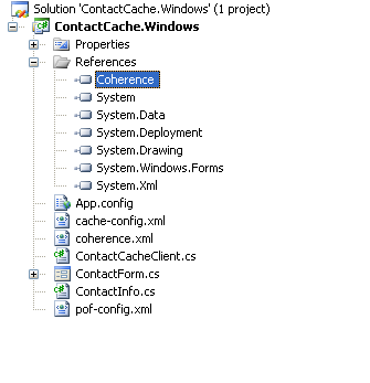 Next, you must create the necessary configuration files and specify their paths in the application configuration settings. This is done by adding an application configuration file to your project (if one was not already created) and adding a Coherence for .NET configuration section (i.e. <coherence/>) to it.