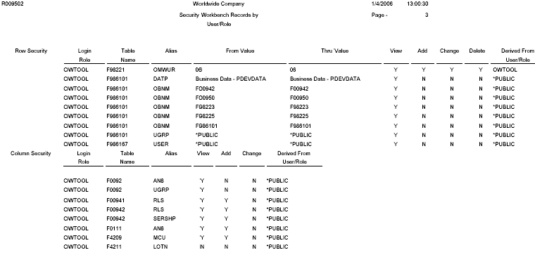 This example shows the results of running the Security Audit Report by Role version of the R009502 report. The data selection of the report has been defined to list security records for the OWTOOL role. This example shows the third page of the report, which lists the row and column security records for the OWTOOL role.