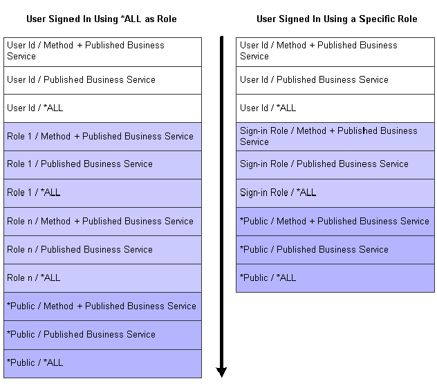 When applying object level security, you need to consider how JD Edwards EnterpriseOne checks for security. When a user signs in, the system first checks the user ID for security. If no object security is assigned to the user ID, then it checks the role (if the user is part of a specific role), and then finally it checks *PUBLIC.