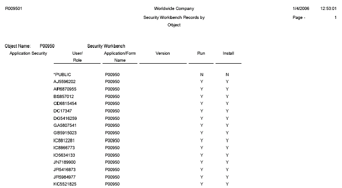 JD Edwards EnterpriseOne provides two Security Workbench Records reports—Security by Object (R009501) and Security by User/Role (R009502)—that you can run to review the current security records by object type and user or role. The Security Workbench Records reports list security records for these objects: