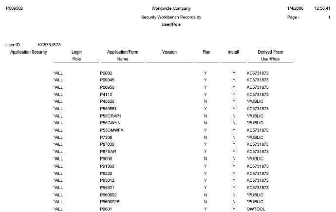 This example shows the results of running the Security Audit Report by User version of the R009502 report. The report lists the security records for a particular user in order of application, row, and then column. This example shows only the first page of the report, which lists the application security records for the user ID.