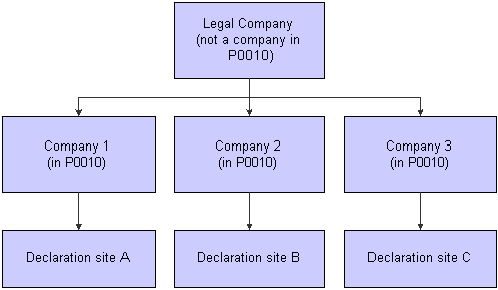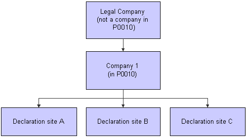 You can set up only one head office for a company, but you can set up as many individual declaration sites as necessary. When you use the GUI/VAT Declaration Site program (P75T001) to set up the relationship between the reporting (legal) company and the companies that are declaration sites, you specify whether a declaration site is a headquarters (HQ) or an individual unit (IU). Each declaration company must have one and only one site designated as a headquarters. You set up all other declaration sites for a declaration company as an individual unit.