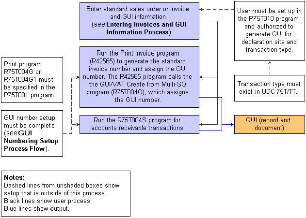 You use a combination of standard JD Edwards EnterpriseOne programs and Taiwan-specific JD Edwards EnterpriseOne programs to set up and work with transactions for which you report VAT and which require that you issue a GUI.