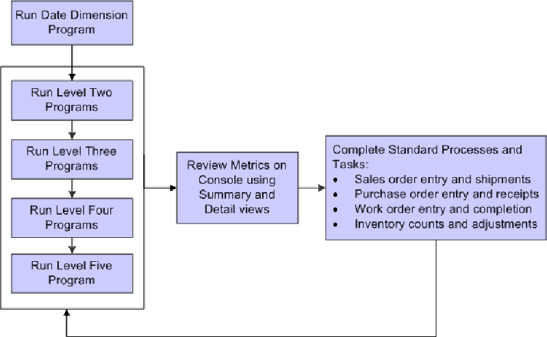 The JD Edwards EnterpriseOne PMD system uses multiple batch programs to load and create the metric data information. You must run the batch programs in a sequential manner for the metric data to be complete and accurate. This diagram illustrates the JD Edwards EnterpriseOne PMD business process flow for data: