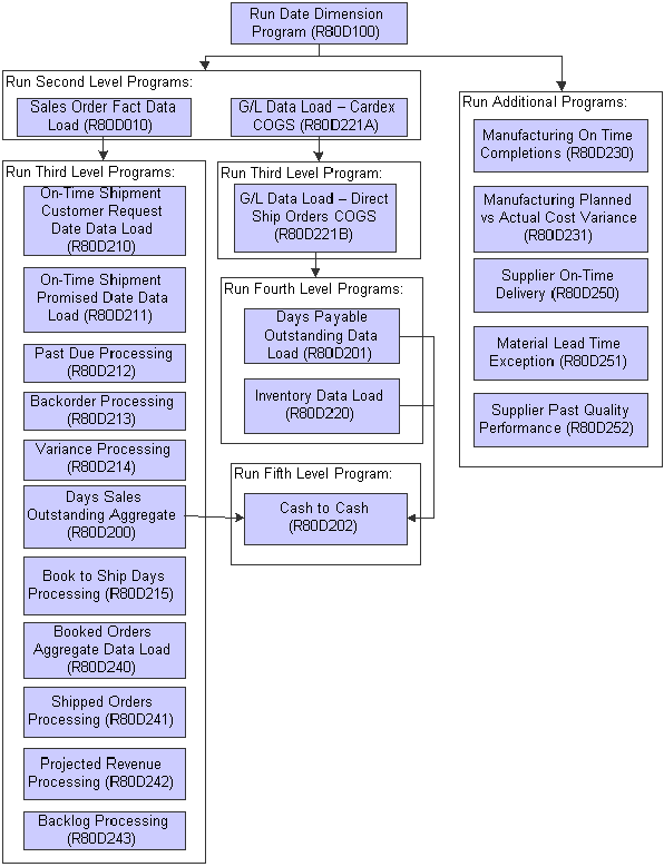 The system must populate tables with data within the JD Edwards EnterpriseOne PMD before you can run subsequent batch programs. The programs have been grouped into different levels based on the data contingencies: