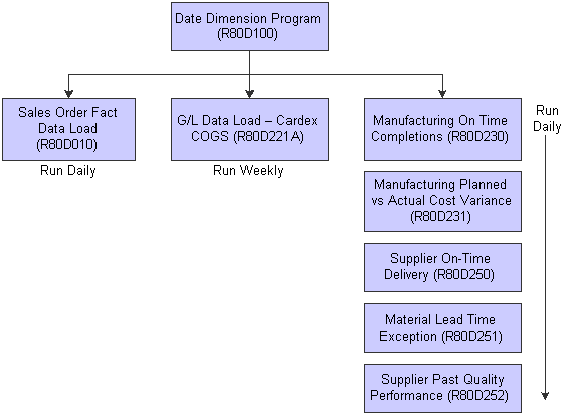 Sales Order Fact Data Load (R80D010) G/L Data Load - Cardex COGS (R80D221A) Manufacturing On Time Completions (R80D230) Manufacturing Planned vs Actual Cost Variance (R80D231) Supplier On-Time Delivery (R80D250) Material Lead Time Exception (R80D251) Supplier Pass Quality Performance (R80D252) |