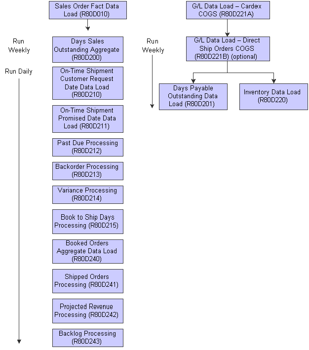 Days Sales Outstanding Aggregate (R80D200) On-Time Shipment Customer Request Date Data Load (R80D210) On-Time Shipment Promised Date Data Load (R80D211) Past Due Processing (R80D212) Backorder Processing (R80D213) Variance Processing (R80D214) Book to Ship Days Processing (R80D215) G/L Data Load - Direct Ship COGS (R80D221B) Booked Orders Aggregate Date Load (R80D240) Shipped Orders Processing (R80D241) Projected Revenue Processing (R80D242) Backlog Processing (R80D243) |