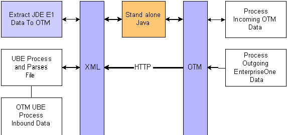 Initially outbound to the Oracle Transportation Management system, you must run the JD Edwards EnterpriseOne programs to extract data from JD Edwards EnterpriseOne. The JD Edwards EnterpriseOne programs write outbound data to a staging table where the data is read and an XML file is generated. Run the standalone Java program to process the generated XML files to Oracle Transportation Management through a HTTP connection. As for the inbound from Oracle Transportation Management to JD Edwards EnterpriseOne, the Oracle Transportation Management system invokes an HTTP post. The application server that listens for the HTTP post validates and authorizes the inbound message and updates JD Edwards EnterpriseOne transmission F49T90 table. All the inbound batch programs parses the information from the F49T90 table into the JD Edwards EnterpriseOne tables.