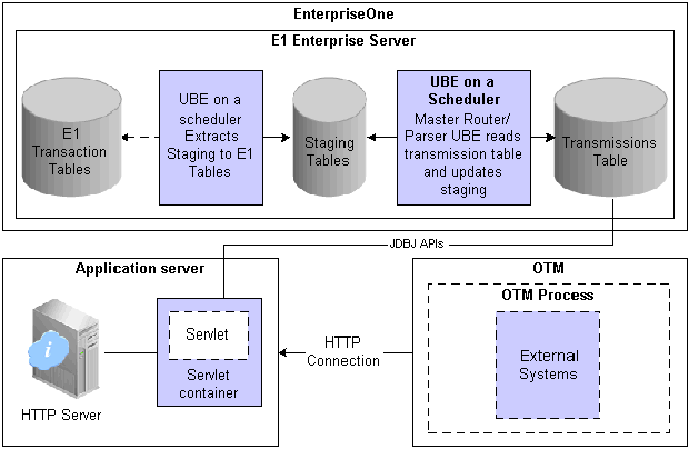 Oracle Transportation Management sends XML-formatted data to JD Edwards EnterpriseOne via a HTTP post. The inbound HTTP receive program deployed on an application server listens for this HTTP post, validates it, and updates the JD Edwards EnterpriseOne transmission table (F49T90).