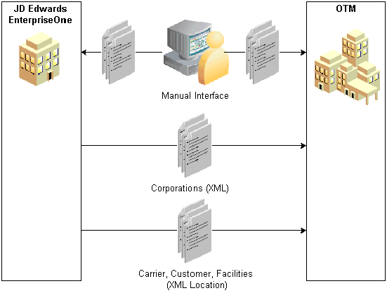 The diagram represents an overview of the key reference data and the methods to synchronize between Oracle JD Edwards EnterpriseOne and Oracle Transportation Management: