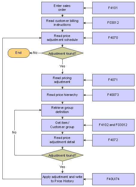 When a sales order is processed, the system first verifies the base price of the item, and then bypasses the standard price adjustments and applies specific schedules and adjustments to the order from the JD Edwards EnterpriseOne Advanced Pricing system.