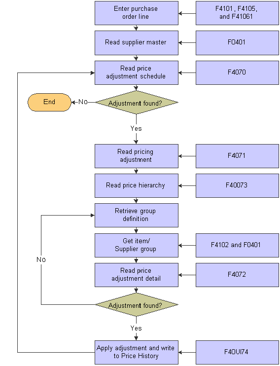 When a purchase order is processed, the system first verifies the unit cost of the item, and then bypasses the standard price adjustments and applies specific schedules and adjustments to the order from the JD Edwards EnterpriseOne Advanced Pricing system.