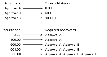 This diagram illustrates how the system would route approvals if you set up a distribution list so that approval is required, starting at a specified amount.