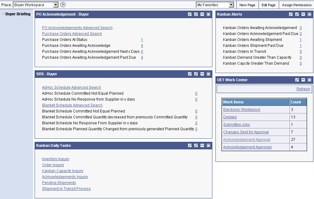 On this page, each of the portlets (PO Acknowledgement - Buyer, SRS - Buyer, and so on), is a copy of the SRM portlet, except for the OET Work Center portlet. Each copy of the portlet has been assigned a name that appears in the dark blue bar. Each portlet has been configured to include different alerts and those alerts have been configured in some cases to use customized descriptions.