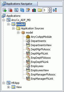 Oracle ADFビジネス・コンポーネントをビジネス・サービス・テクノロジとして使用すると、データ・モデル・コンポーネントがOracle ADFデータ・コントロールとしてモデル・レイヤーに公開されます。サンプル・アプリケーションでは、データ・コントロール・インタフェースはすでに実装されているため、作成するOracle ADFビジネス・コンポーネントのデータ・コントロールを作成する必要はありません。
