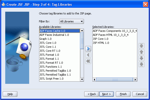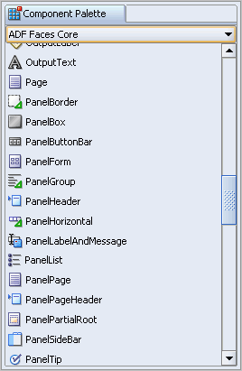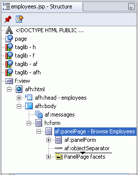 次の手順では、ページに項目を追加してページ・レイアウトを定義します。これまでの章と同様に、コンポーネント・パレットを使用して、タグをページにドロップします。このページでは、ADF Faces PanelPageコンポーネントを使用します。