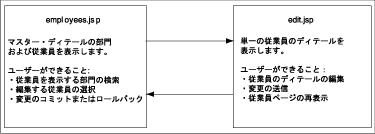 ナビゲーション・ダイアグラムには、両方のナビゲーション・ケースが表示されます。1つは、ユーザーが従業員の詳細を編集できるようにemployees.jsp