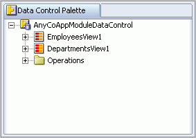 次の手順では、ページに項目を追加して、ユーザーが部門およびその従業員を表示できるようにします。これらの手順では、データ・コントロール・パレットを使用します。これは、デフォルトではJDeveloperの表示の右、コンポーネント・パレットの横にあります。データ・コントロール・パレットによって、ADFデータ・コントロールという名前のデータ・オブジェクトをページにドロップできます。