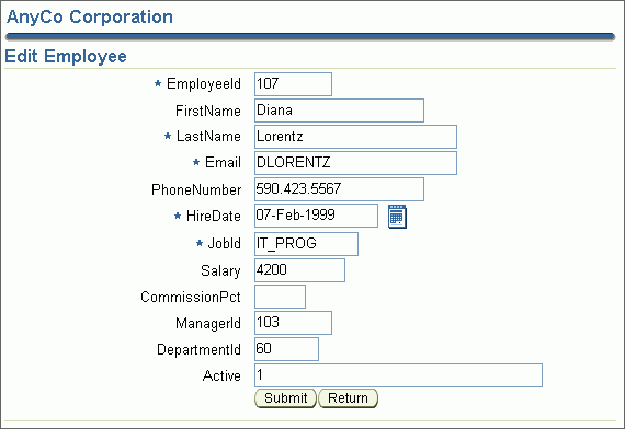 ユーザーが従業員データを編集できる編集ページを作成するには、ADF Facesコンポーネントを使用して、従業員ページとまったく同じ方法でページをレイアウトします。