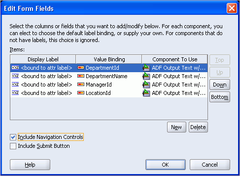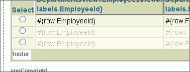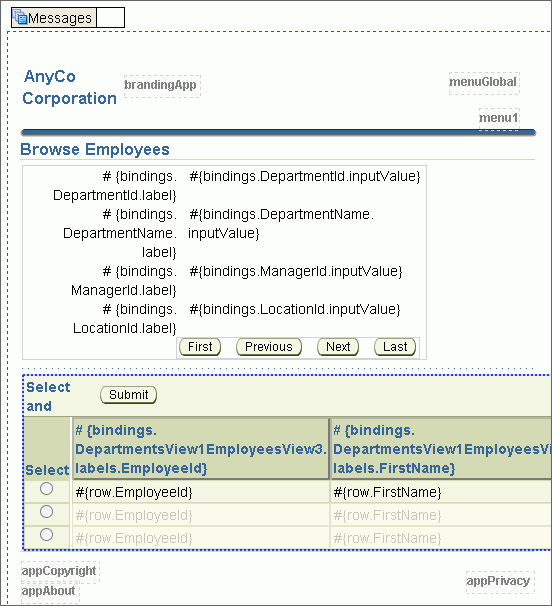最初の段階は、部門、および別の部門とその関連従業員へのナビゲーション・ボタンを表示する読取り専用フォームを追加することです。このことを行うには、modelプロジェクトで作成したデータ・コントロールの1つをページにドラッグします。