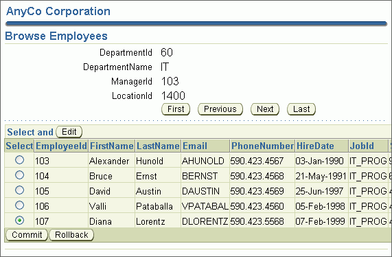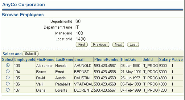 スキーマにアクセスします。マスター表として部門表を使用して、従業員表からディテール・データを表示します。この章では、Oracle ADFとJDeveloperを使用してこのアプリケーションを作成する方法について説明します。