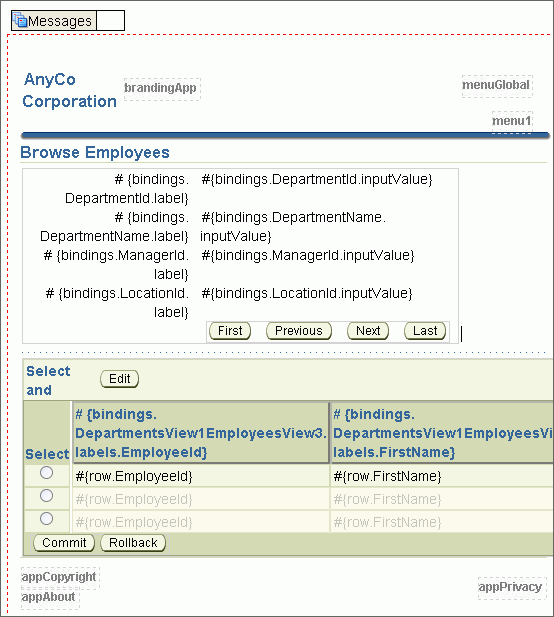 残りの処理は、従業員ページを表示したユーザーが編集ページにナビゲートして従業員の詳細を編集できるようにすることです。これを行うには、ナビゲーション・ダイアグラムで定義したeditという名前のナビゲーション・ケースを使用します。従業員ページの従業員表にはすでにボタンがあり、ユーザーが編集ページにナビゲートするために使用できます。