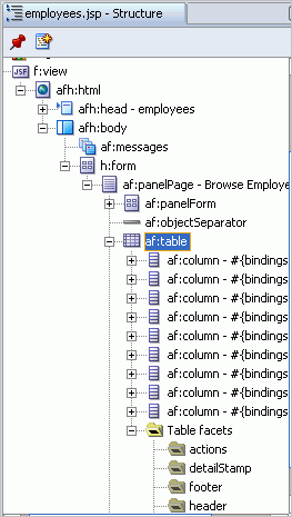 が表示されている状態で、「構造」ウィンドウで表コンポーネント(af:table)を開きます。構造内には、Table Facetsフォルダがあります。