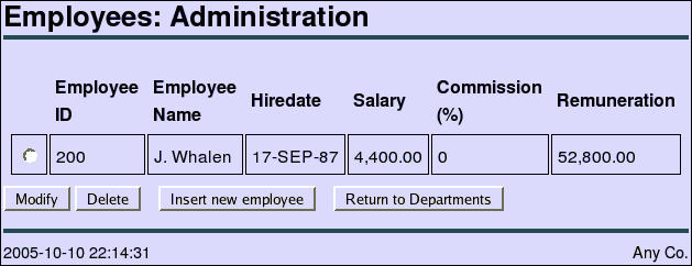 echo <<<END <form method="post" action="$posturl"> <table> <tr> <th> </th> <th>Employee<br>ID</th> <th>Employee<br>Name</th> <th>Hiredate</th> <th>Salary</th> <th>Commission<br>(%)</th> <th>Remuneration</th> </tr> END; // Write one row per employee foreach ($employeerecords as $emp) { echo '<tr>'; echo '<td><input type="radio" name="emprec" value="'.htmlentities($emp['EMPLOYEE_ID']).'"></td>'; echo '<td align="right">'.htmlentities($emp['EMPLOYEE_ID']).'</td>'; echo '<td>'.htmlentities($emp['EMPLOYEE_NAME']).'</td>'; echo '<td>'.htmlentities($emp['HIRE_DATE']).'</td>'; echo '<td align="right">'.htmlentities($emp['SALARY']).'</td>'; echo '<td align="right">'.htmlentities($emp['COMMISSION_PCT']).'</td>'; echo '<td align="right">'.htmlentities($emp['REMUNERATION']).'</td>'; echo '</tr>'; }