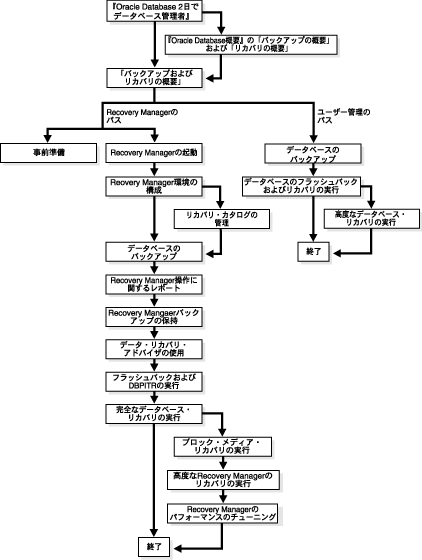図1-1に、バックアップおよびリカバリのドキュメントにナビゲートする場合の推奨方法を示します。ロードマップは、Recovery Managerによるバックアップとリカバリ、およびユーザー管理によるバックアップとリカバリの2つのメイン・パスに分かれています。それぞれのメイン・パスから分岐し、再度結合するオプションのパスも示されています。