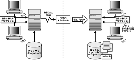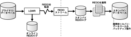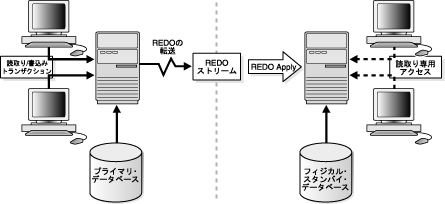プライマリ・データベースから転送されたREDOデータは、スタンバイ・データベース上でスタンバイREDOログに書き込まれます。適用サービスは、REDOデータをスタンバイ・データベースに自動的に適用し、プライマリ・データベースとの一貫性を維持します。データを読取り専用にすることも可能です。