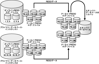 この場合は、プライマリ・データベースのインスタンス1がローカル・アーカイブREDOログ・ファイル1、2、3、4、5にREDOデータをアーカイブし、スタンバイ・データベース宛先にREDOデータを転送するのに対し、インスタンス2がローカル・アーカイブREDOログ・ファイル32、33、34、35、36にREDOデータをアーカイブし、同じスタンバイ・データベース宛先にREDOデータを転送します。スタンバイ・データベースでは、アーカイブREDOログ・ファイルを適用する正しい順序が自動的に判断されます。