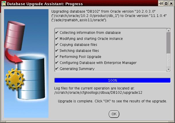 インストールが完了したら、1つ以上のアシスタントが起動する場合があります。インストール中にDBUAを実行するように選択した場合、アップグレードはDBUAが起動したときに開始できます。ただし、DBUAを使用してアップグレードを行う前に、アップグレード前情報ツールを実行して、DBUAで確認される項目のタイプを確認しておくことをお薦めします。 (「アップグレード前情報ツールの実行」を参照してください。)インストールの完了後、単独でDBUAを実行できます。