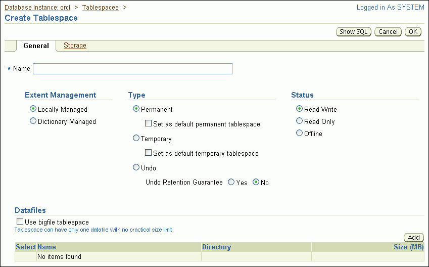 表領域の作成ページが表示され、一般サブページが表示されます。