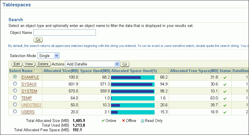 Oracle Enterprise Manager Database Control(Database Control)を使用して、表領域を変更できます。たとえば、データファイル・サイズの増加、および他のデータファイルの追加によって表領域を拡張したり、自動拡張を設定したり、領域使用率のアラートしきい値を変更したり、ステータスをオフラインにすることができます。クリティカルまたは警告アラートを受け取ったとき、(アラートが使用可能な領域に関することの場合は)領域を拡張するか、または(アラートがデータの破損その他の深刻なエラーに関することの場合は)ステータスをオフラインにしてリカバリする必要があります。