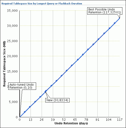 固定サイズのUNDO表領域または自動拡張が無効な表領域に対しては、アクティブな最長実行問合せよりわずかに長くなるようにUNDO保存期間がチューニングされるのではなく、システムのアクティビティとUNDO表領域のサイズに基づいて、最適な保存が可能になるようにUNDO保存期間が動的にチューニングされます。固定サイズのUNDO表領域に対するこの最適な保存期間は、アクティブな最長実行問合せよりはるかに長くすることもできるため、Oracle Flashback操作への対応が強化されます。