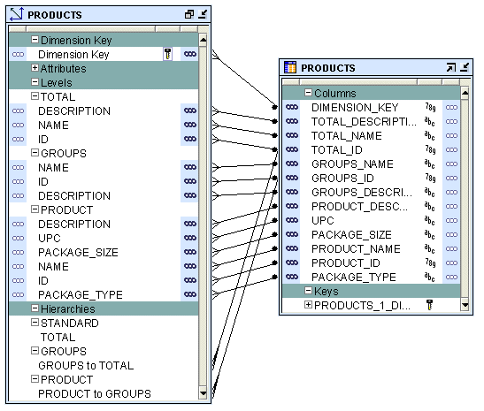 たとえば、「ディメンションの例」に記載されているPRODUCTSディメンションの場合、PRODUCTSディメンションのグループ・レベルの名前属性は、Products_tab表のGroup_name属性に格納されます。名前属性の上でマウスを押したまま、Products_tab表のGroup_name属性にドラッグ・アンド・ドロップします。