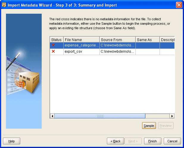この例では、2つのフラット・ファイルのインポートを選択しました。「インポート・メタデータ・ウィザード」の「サマリー」ページで、ファイルの1つを選択し、次に「サンプル」を選択して「フラット・ファイル・サンプル・ウィザード」を起動します。