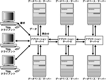 従来の複数層アーキテクチャ環境では、アプリケーション・サーバーはクライアントにデータを提供し、クライアントとデータベース・サーバー間のインタフェースとして機能します。このアーキテクチャは、インターネットの普及により重要度が増しています。