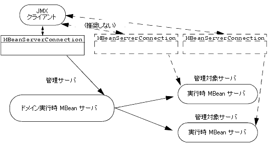 クライアントが複数のサーバの実行時 MBean をモニタする場合や、クライアントが別の JVM で実行されている場合は、ドメイン内の各サーバ インスタンス上のそれぞれの実行時 MBean サーバに個別に接続するのではなく、管理サーバ上のドメイン実行時 MBean サーバに接続することをお勧めする。